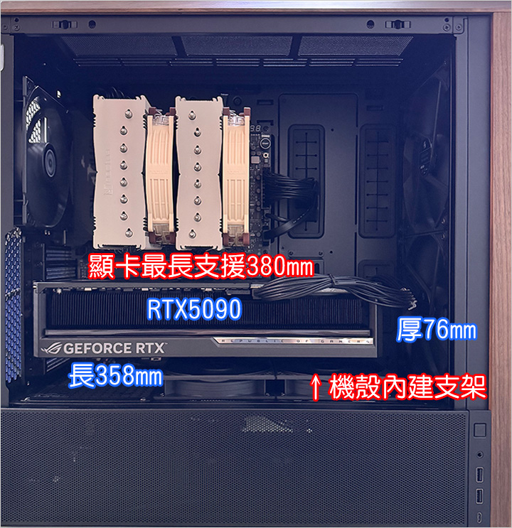 本例5090,長358mm、厚76mm,這張顯卡是一定要放支架的。