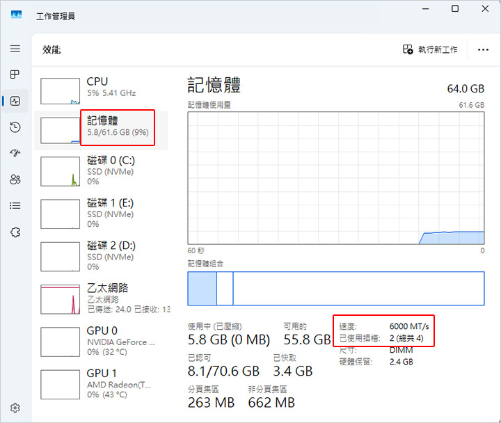 如果不開啟EXPO超頻,速度只有4800MT/s,開了EXPO就會跑6000MT/s。