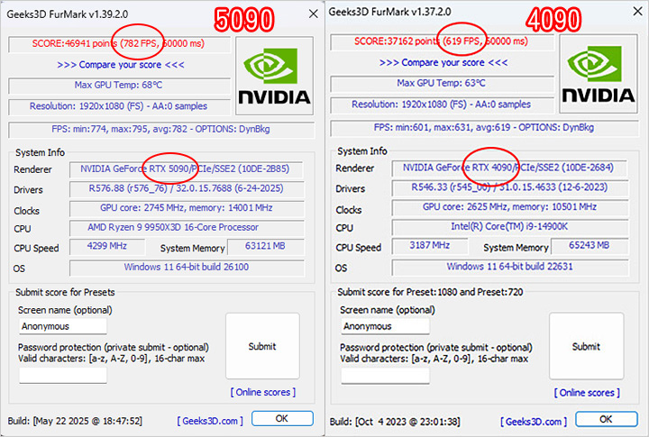 五 華碩 ROG-ASTRAL-RTX5090-O32G-GAMING (三風扇)FPS約=782幀,上右圖放一張4090約619幀做比較。